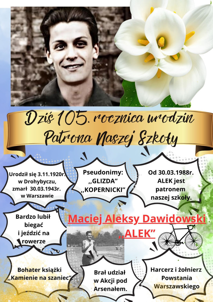 3. listopada przypadła 105. rocznica urodzin naszego Patrona - Macieja Aleksego Dawidowskiego "ALKA" - uczniowie podczas lekcji wspominali Alka, dowiedzieli się kilka ciekawostek o ALKU, a w klasie IIa uczniowie wykonali portret swojego Patrona. To był udany dzień!